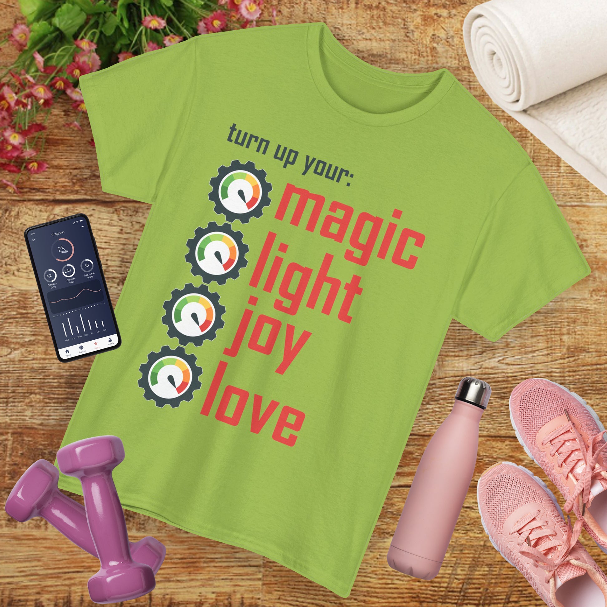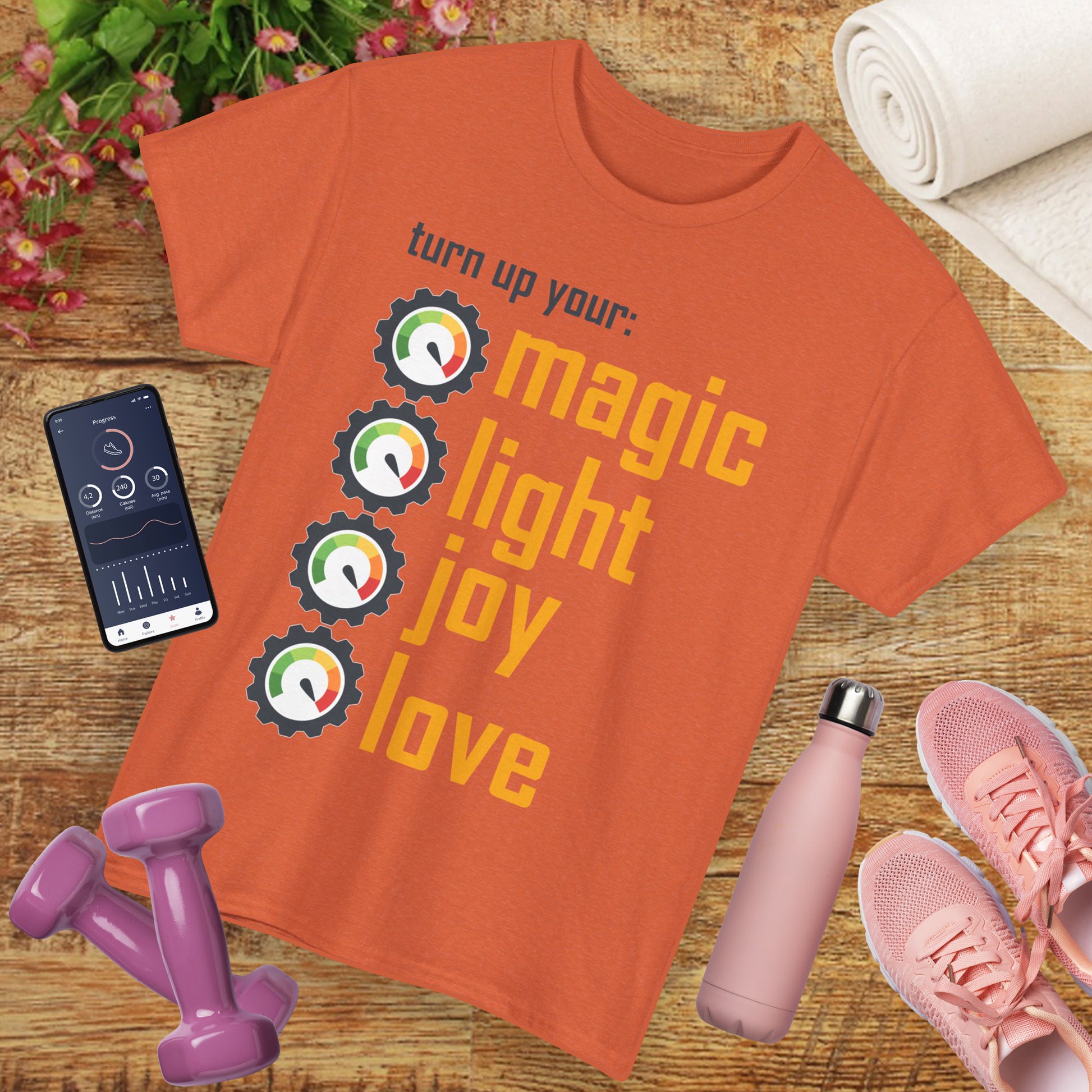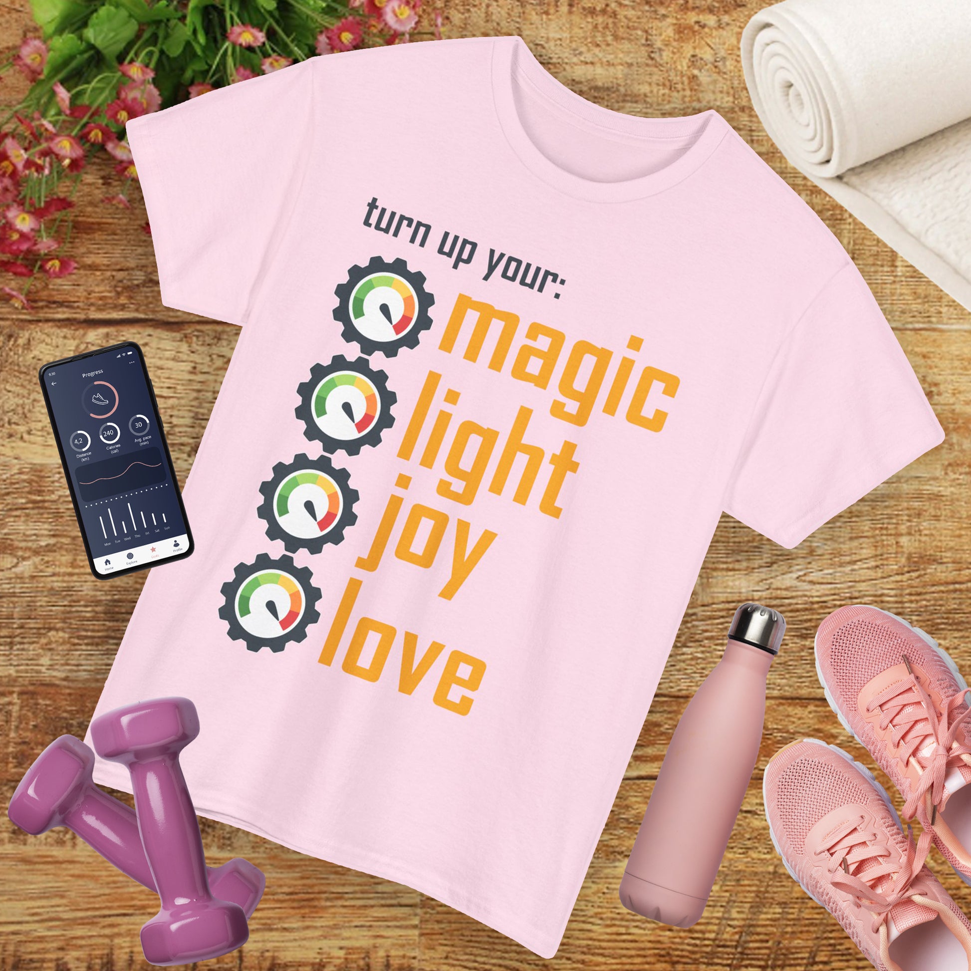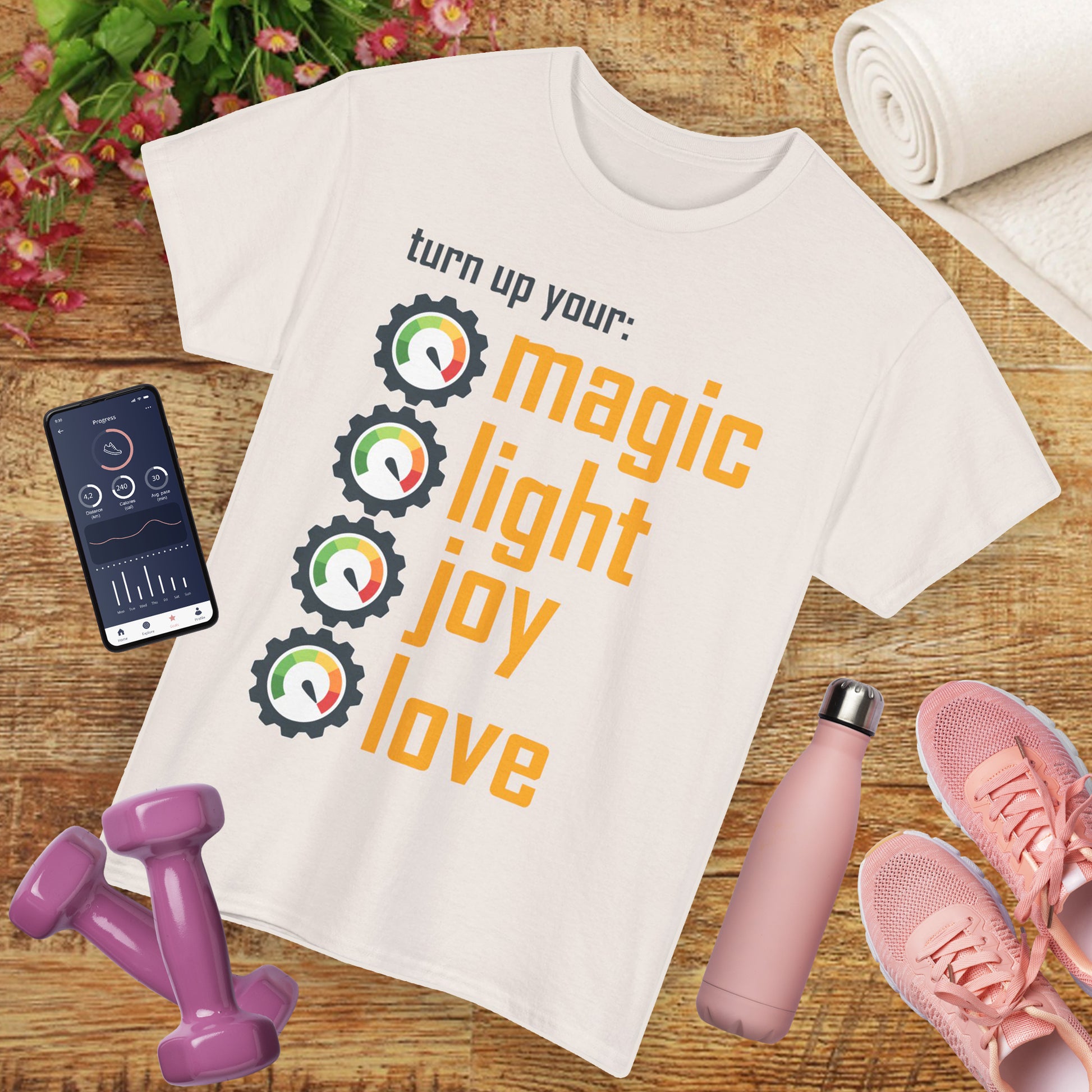 Step into your full power with the Frequency Rising Tee, a joyful celebration of your radiant essence. With speedometers soaring beside each word — Magic, Light, Joy, Love — this design is a soulful call to dial up your inner brilliance and live out loud. It’s not just a shirt — it’s a wearable vibe shift.