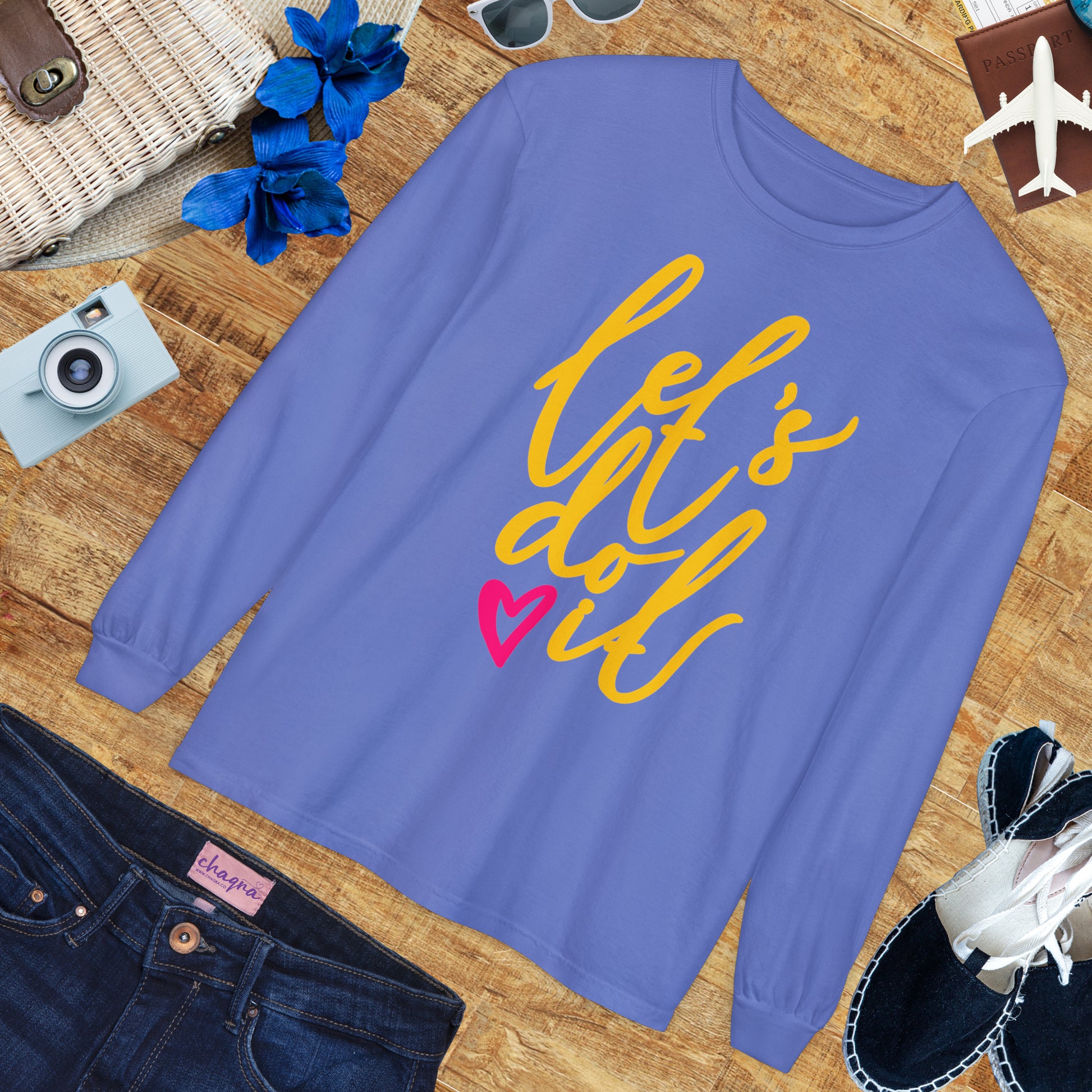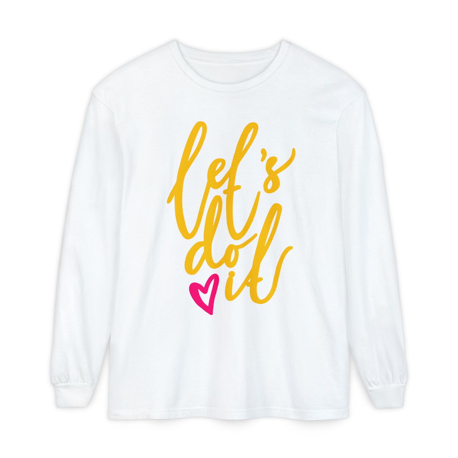 This Unisex Garment-Dyed Long Sleeve Tee features the uplifting mantra “Let’s Do It” written in an artful flow, accented with a sweet heart that adds just the right dose of love-powered motivation. It’s an invitation to act with joy, move with courage, and leap into the moment — all wrapped in cozy, breathable comfort.