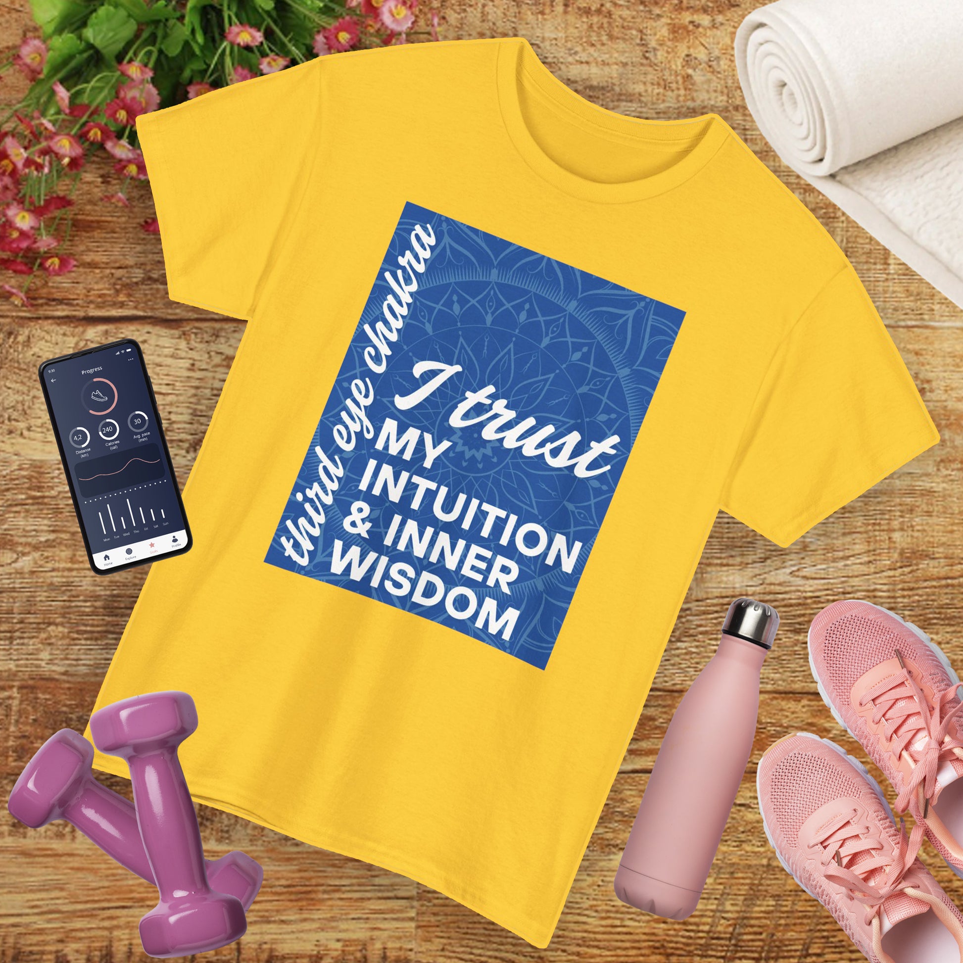 Awaken your inner wisdom and embrace your intuitive power with our Inner Vision Tee, inspired by the Third Eye Chakra. This captivating indigo design features a delicate mandala silhouette alongside the empowering affirmation: "I Trust My Intuition and Inner Wisdom."💙✨