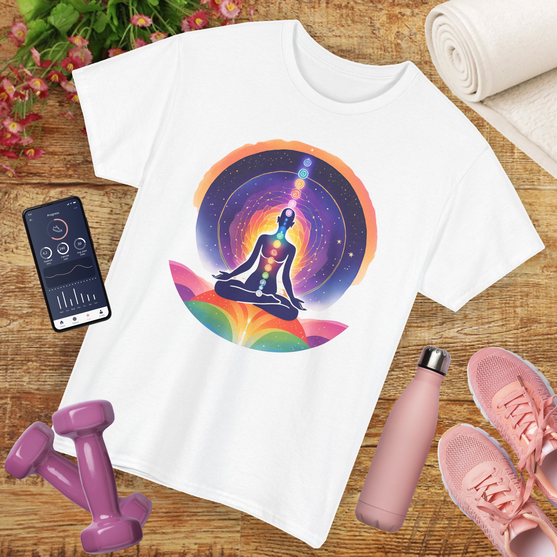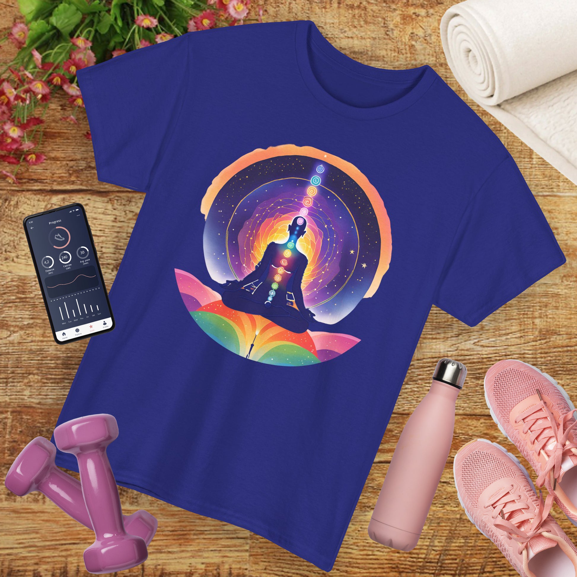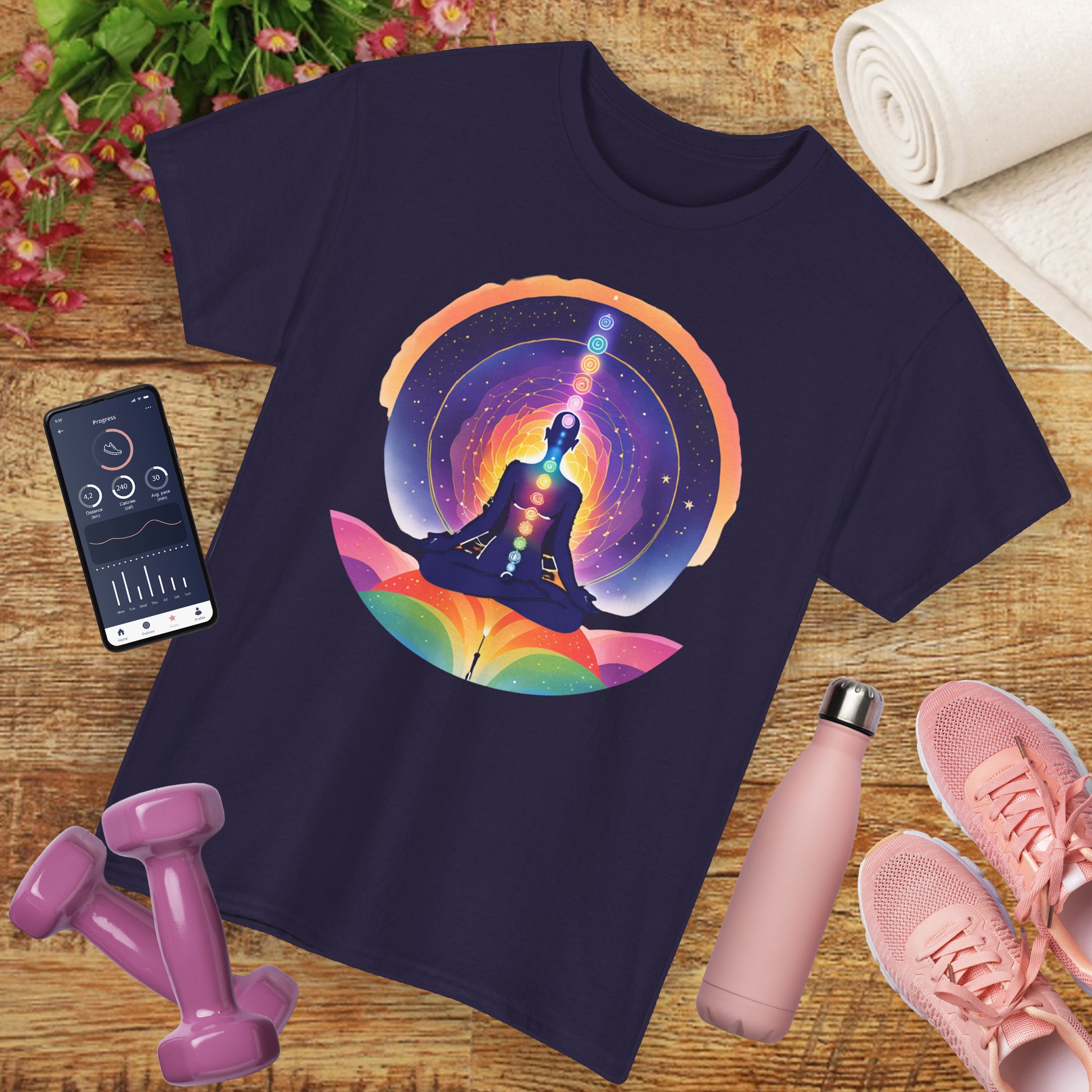 Step into the cosmic rhythm of the universe with this serene tee. Adorned with a meditating figure centered amidst a celestial dance of stars, galaxies, and vibrant chakras, this design is a powerful invitation to align your energy, ignite your light, and journey inward. Each chakra point extends into the universe, reminding us of our infinite potential and our deep connection to all that is.