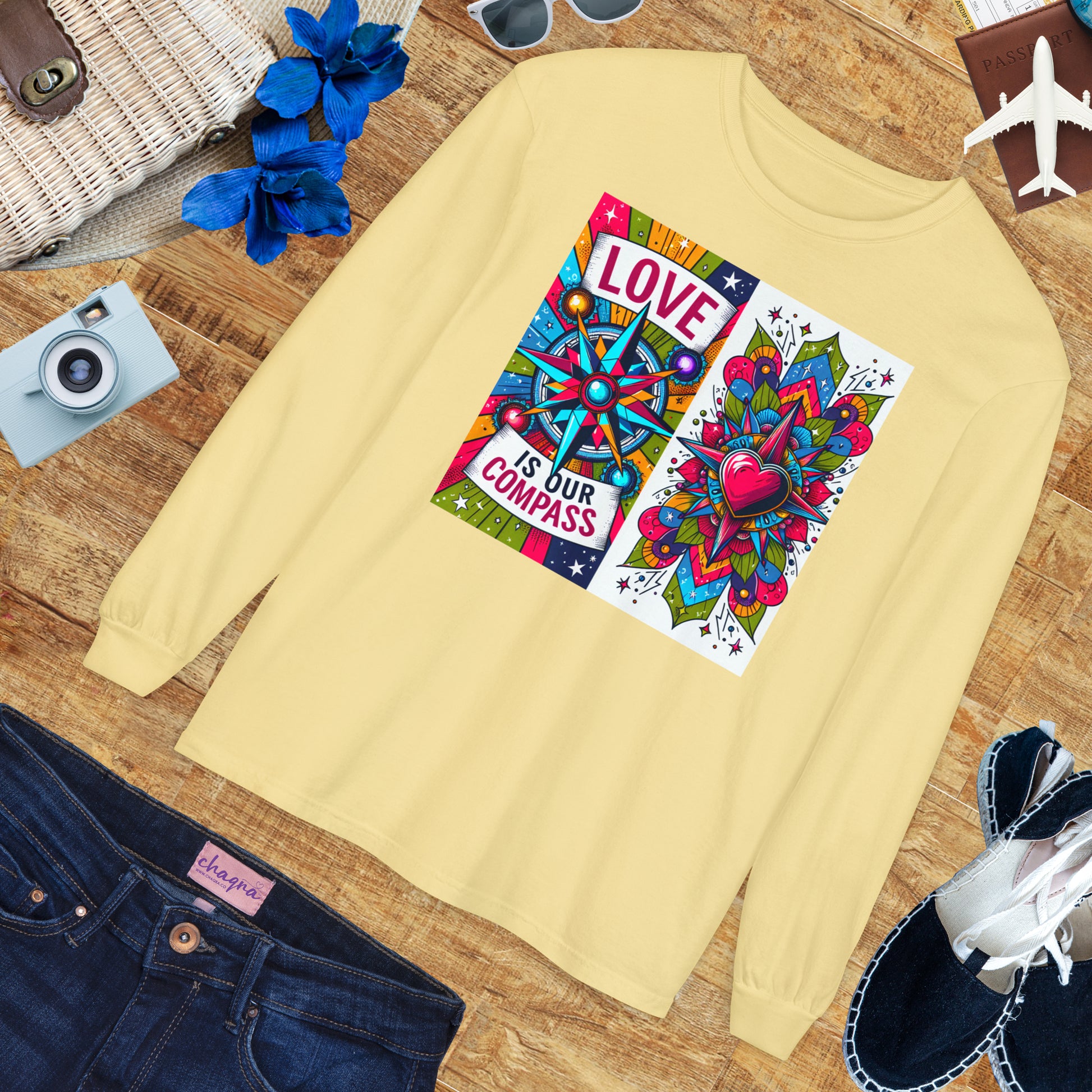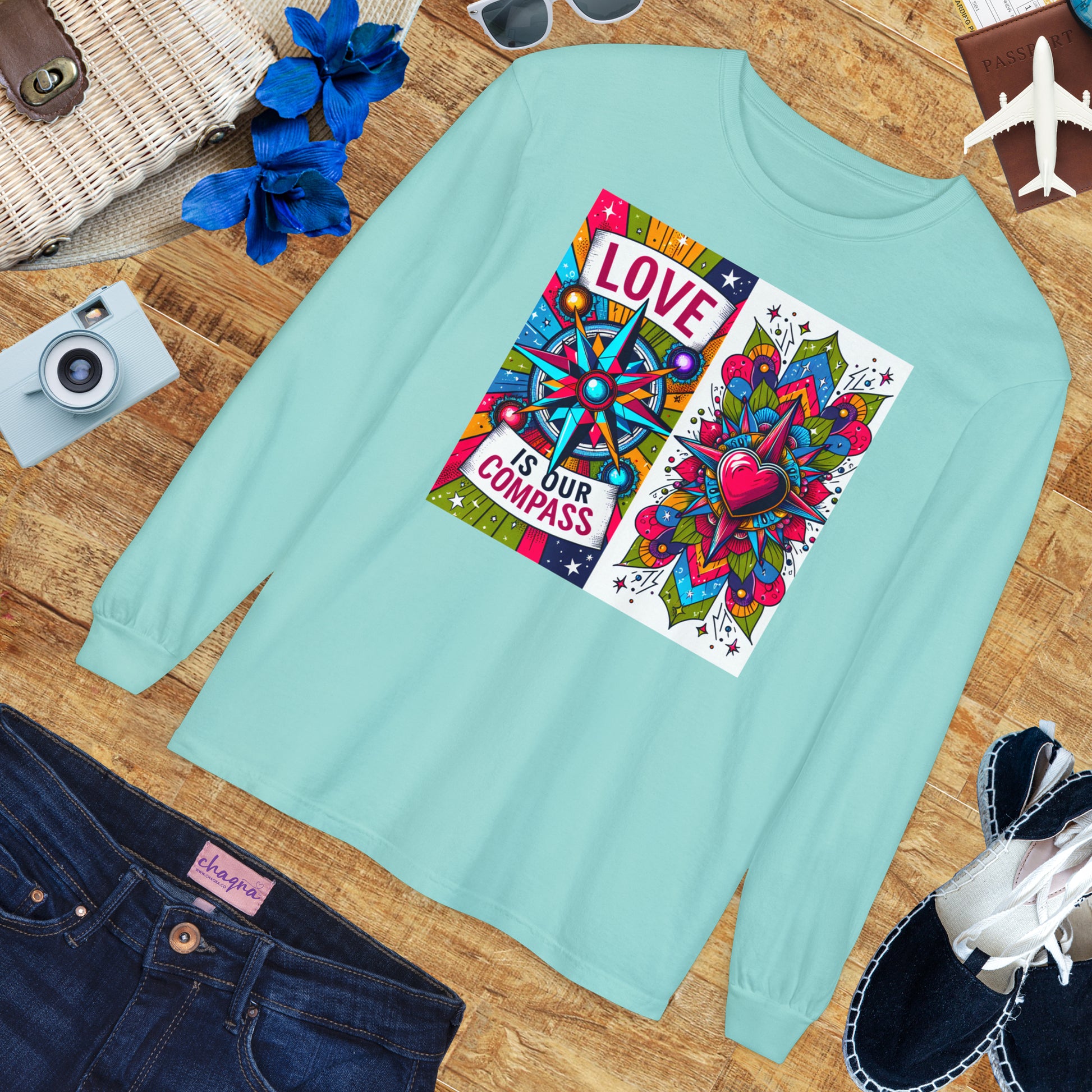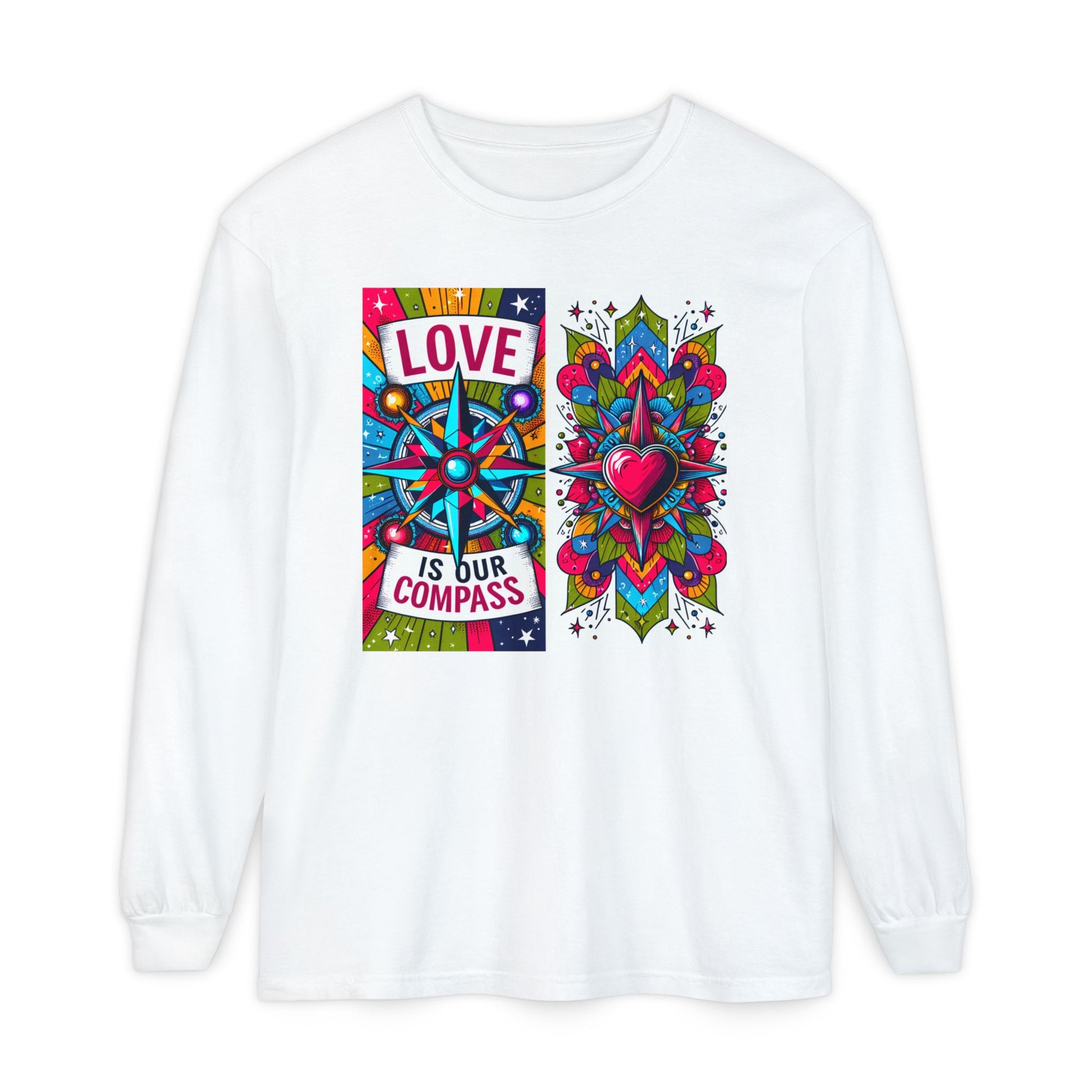 This Unisex Garment-Dyed Long Sleeve Tee features a beautifully artistic compass design paired with the powerful affirmation: “Love Is Our Compass.”
