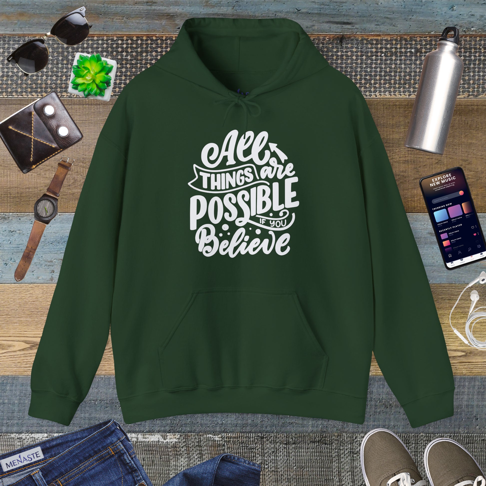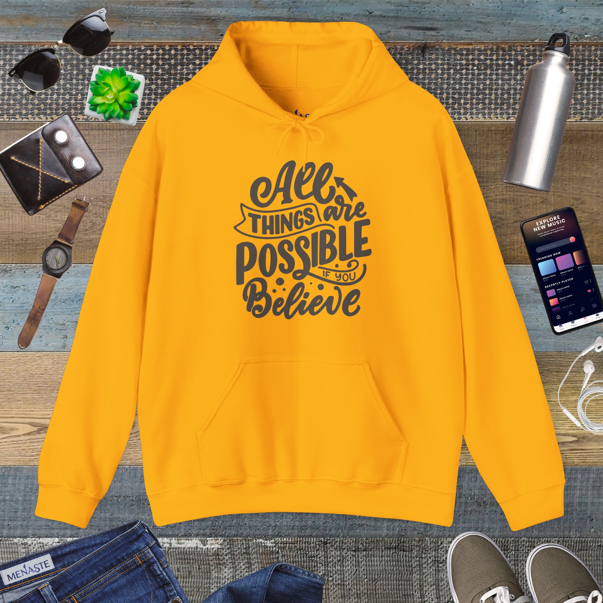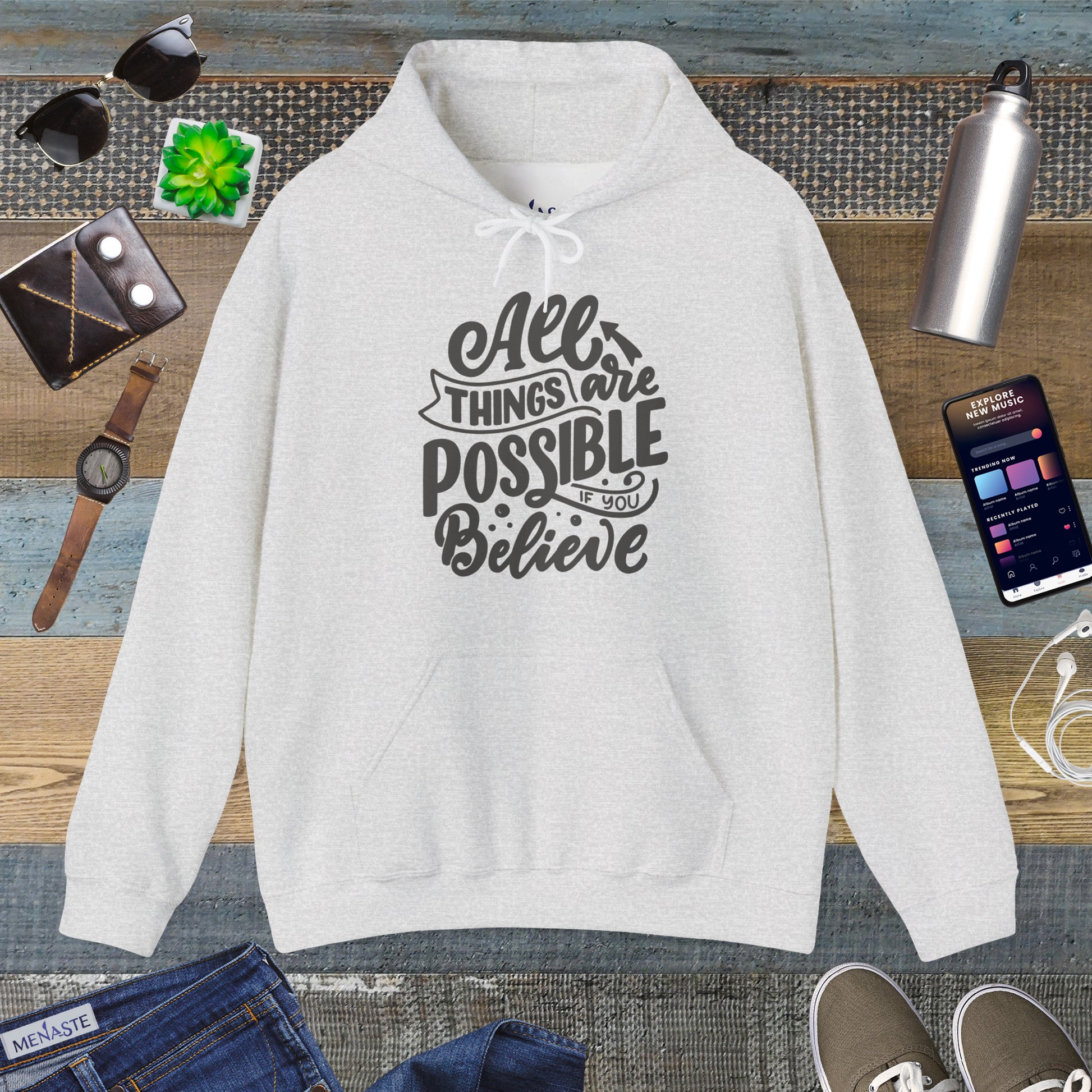 Thereβs a force within you that responds when you choose belief over doubt. ALL THINGS ARE POSSIBLE IF YOU BELIEVE isnβt just a phrase β itβs an energetic truth. This hoodie is for the man who knows his reality is shaped from the inside out. The man who trusts his vision, honors his journey, and moves with unwavering faith in what heβs becoming.