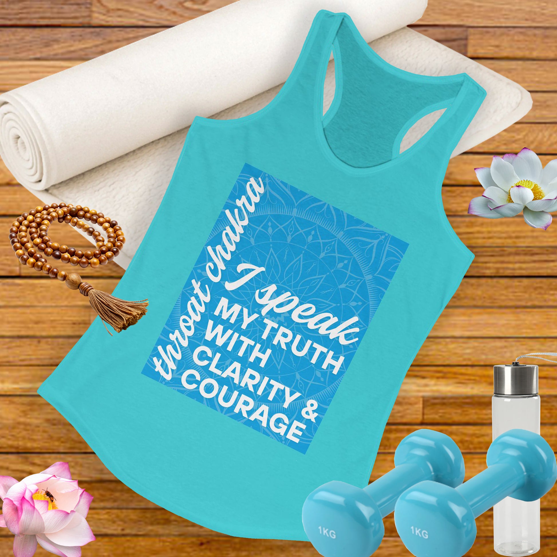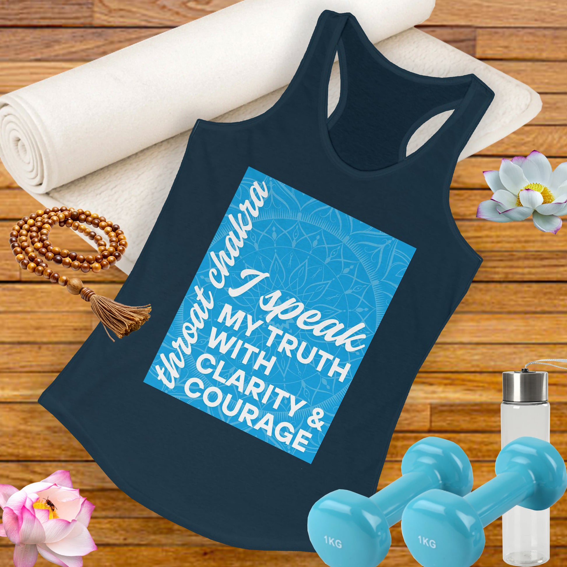 The design features the calming blue Throat Chakra symbol with the empowering affirmation: “I speak my truth with clarity and courage.” Wear this tank as a reminder that your voice matters, and your words carry power.