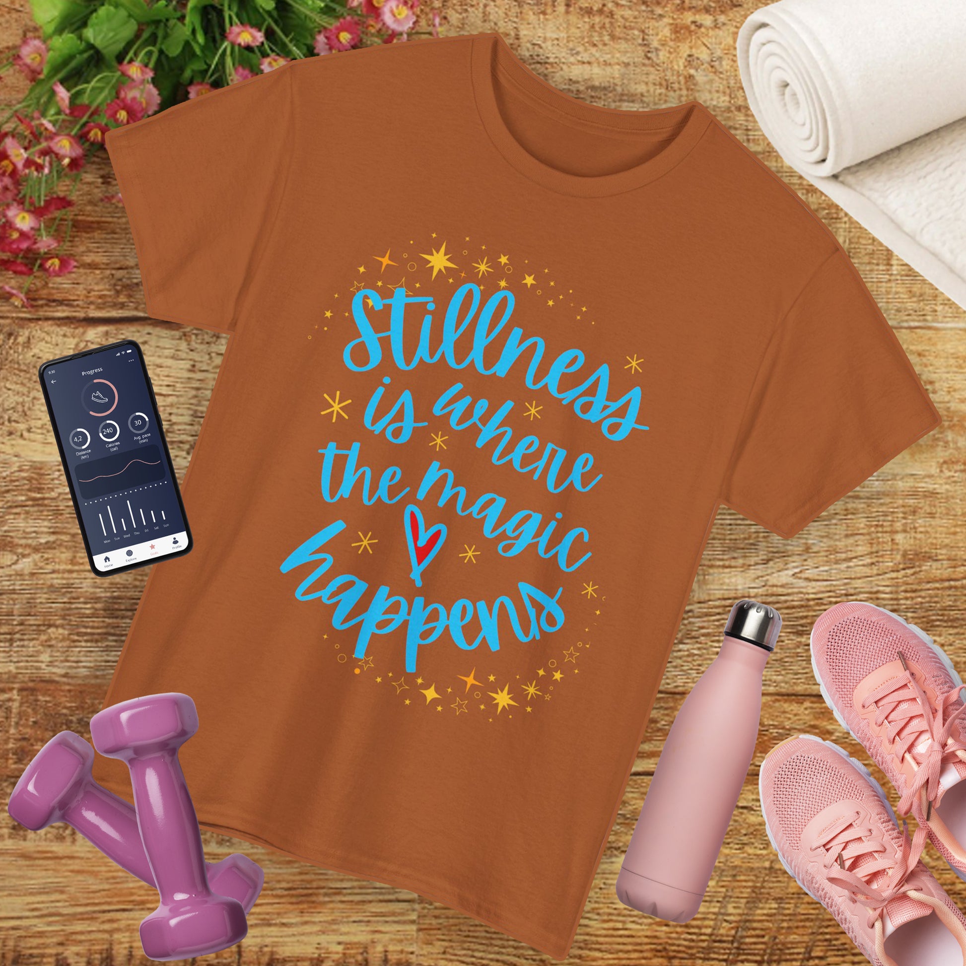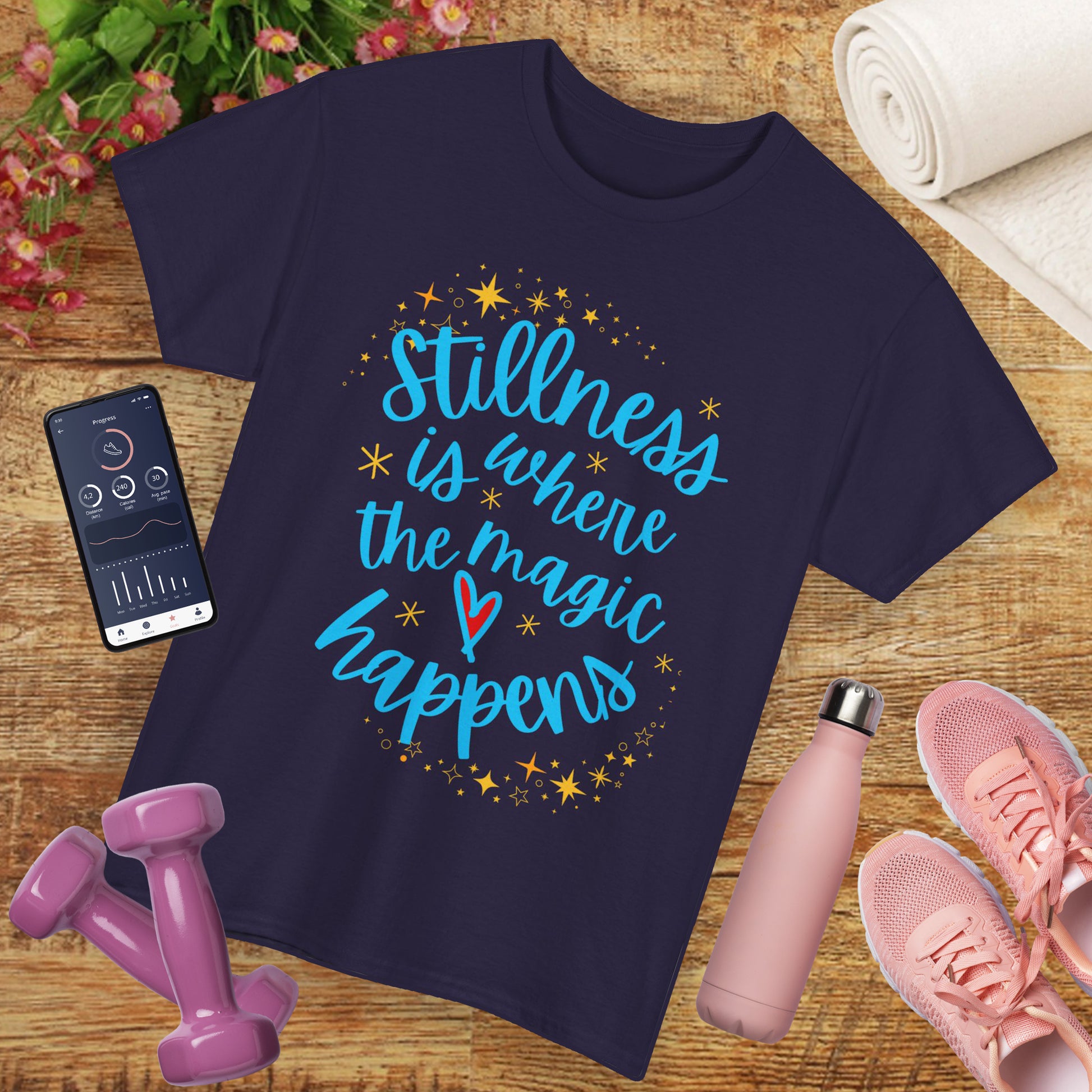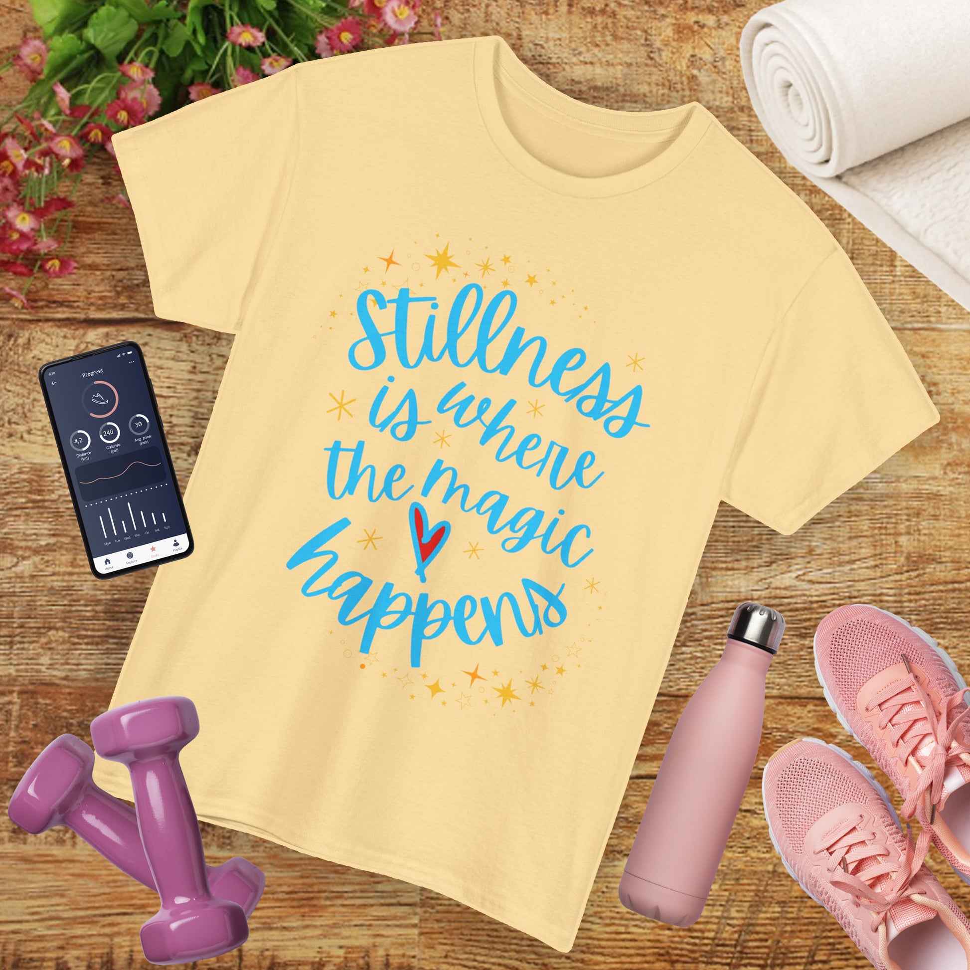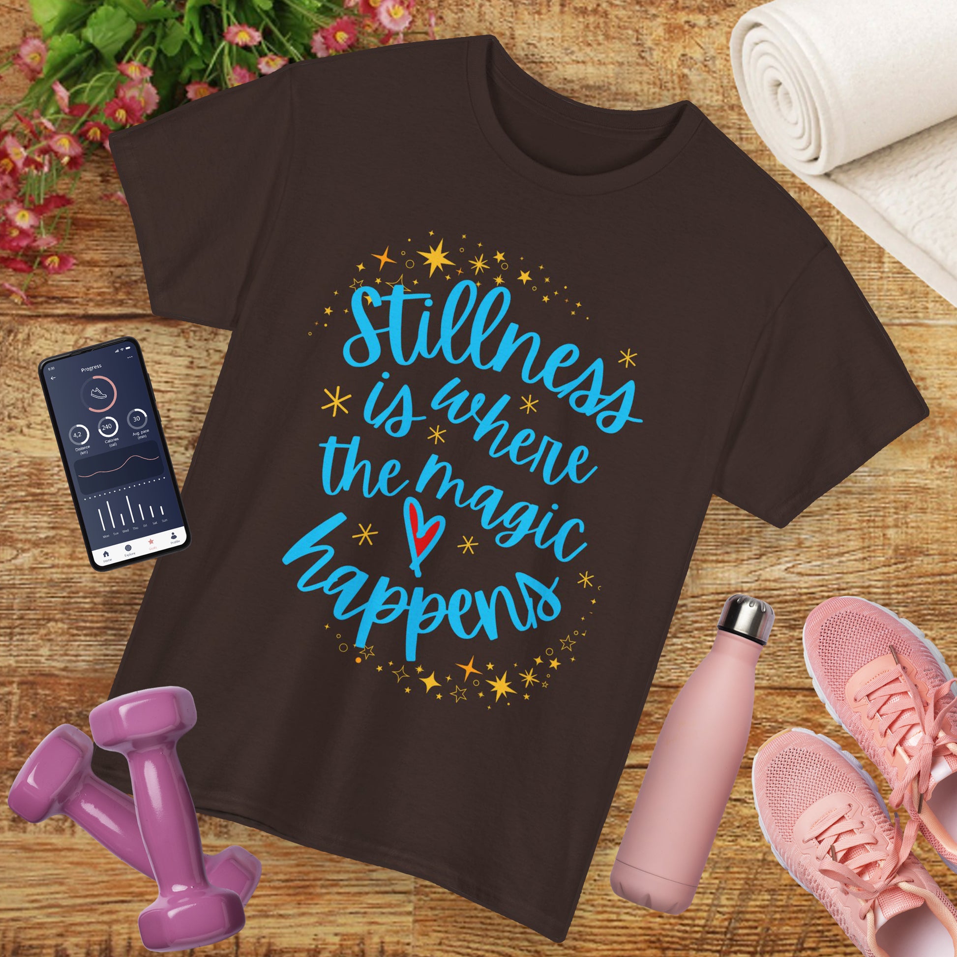 In a world full of noise, stillness is your superpower. This cozy, high-quality tee features the gentle reminder that “Stillness is where the magic happens,” adorned with delicate stars and a heart—inviting you to pause, breathe, and reconnect with your inner peace.